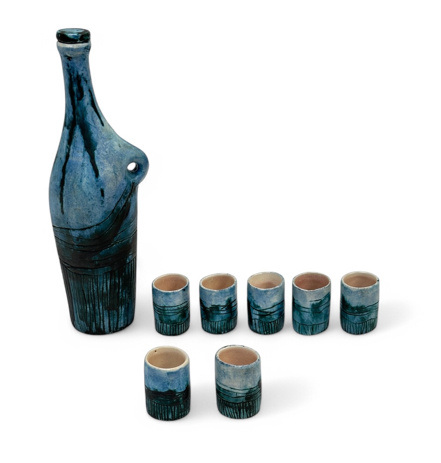 Jacques BLIN (1920-1995) Service comprising a ring-grip bottle and seven goblets, circa 1960 Blue and black glazed ceramic proof with stripe decoration Signed J.Blin on the back of the bottle H. 32.5 cm (bottle) H. 6 cm (tumblers) Bibliography: - Christine Lavenu, Jacques Blin, Louvre Victoire, 2019, close-up model reproduced on p. 119. Expert : Romain Coulet