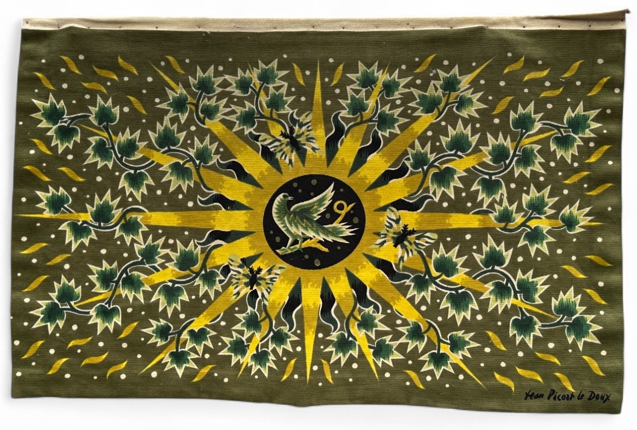 Jean PICART LE DOUX (1902-1982) after a carton Printed tapestry, circa 1960, Lumière d'été pattern, decorated with a radiant bird on a green background. Signed Jean Picard le Doux lower right. Bolduc missing. 112.5 x 173.5 cm. Robert Four workshop Expert : Romain Coulet