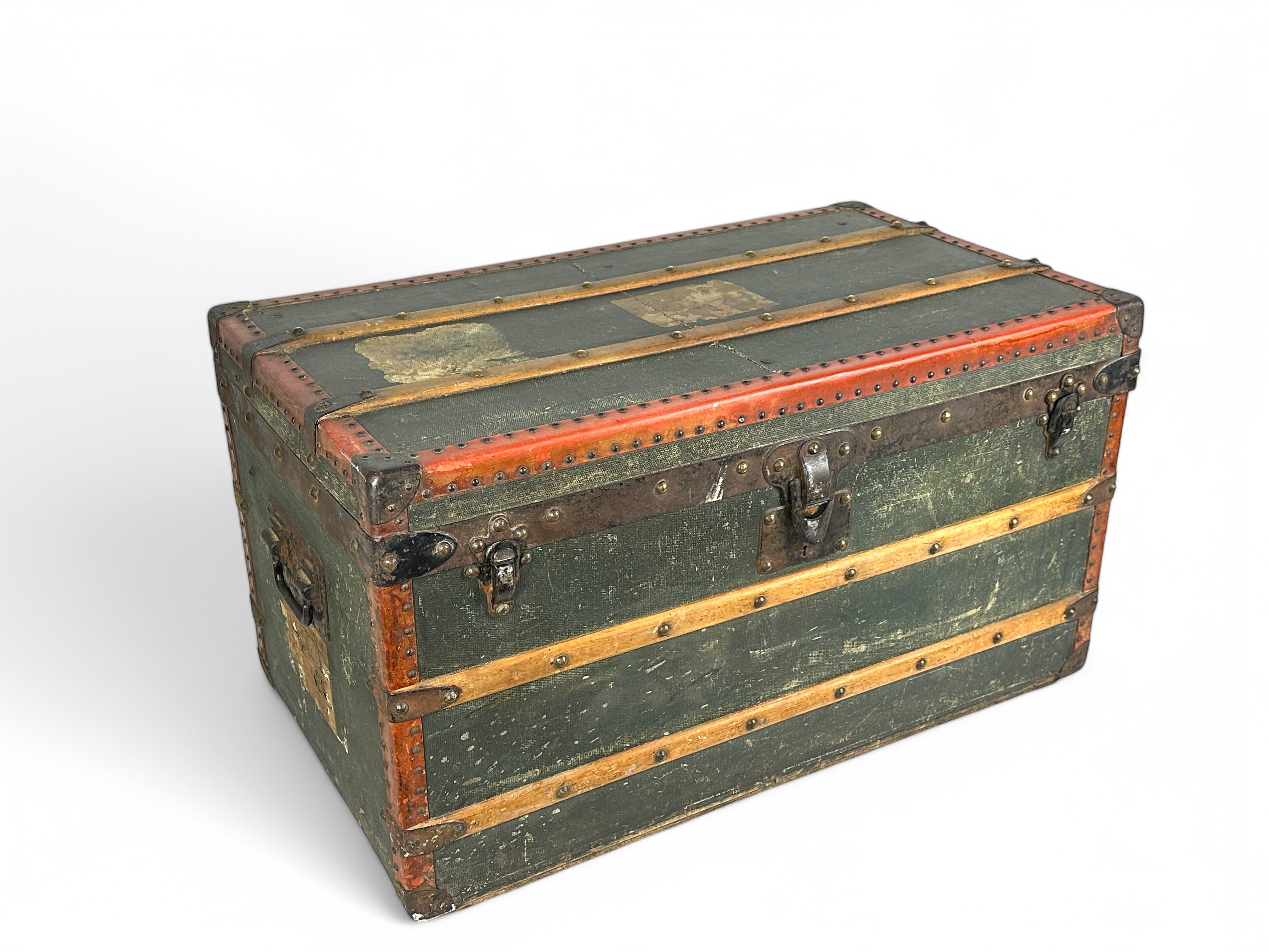 LOUIS VUITTON Travel trunk in green coated canvas, leather edging, black patinated metal corners, angles and side handles, wooden reinforcements. Old shipping labels Inside label with addresses of stores in Paris and London, numbered 551572 44 x 80.5 x 46 cm Rubbing, wear, traces of moisture