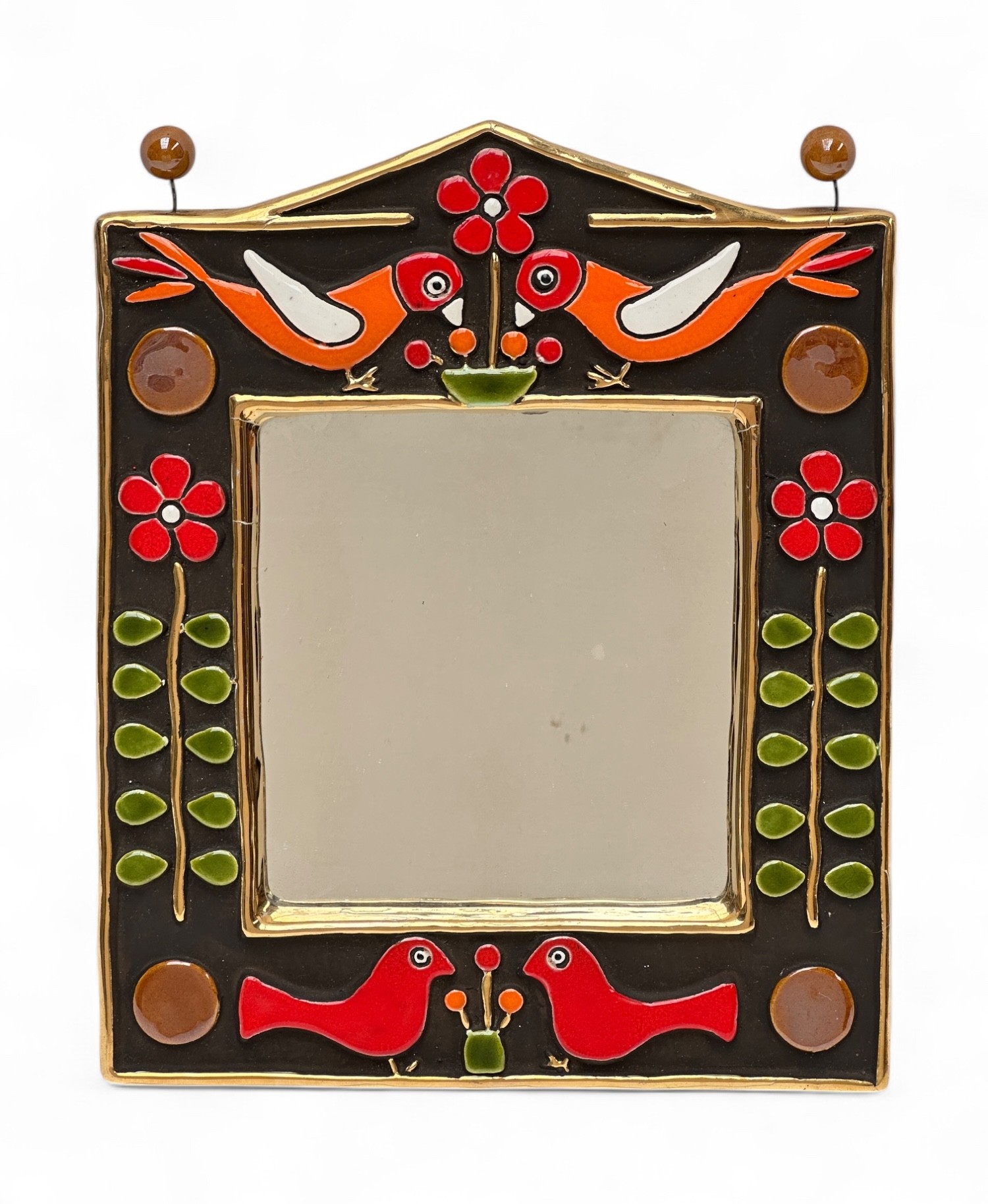 Mithé ESPELT (1923-2020) Bocage model wall mirror, circa 1970, decorated with two balls, birds and flowers in stamped earthenware and polychrome enamel and cracked gold. H. 27 cm. - L.: 22.5 cm. Bibliography - Antoine Candau, Mithé Espelt - le luxe discret du quotidien, Edition Odyssée, 2020, similar model reproduced on p. 151. Expert : Romain Coulet