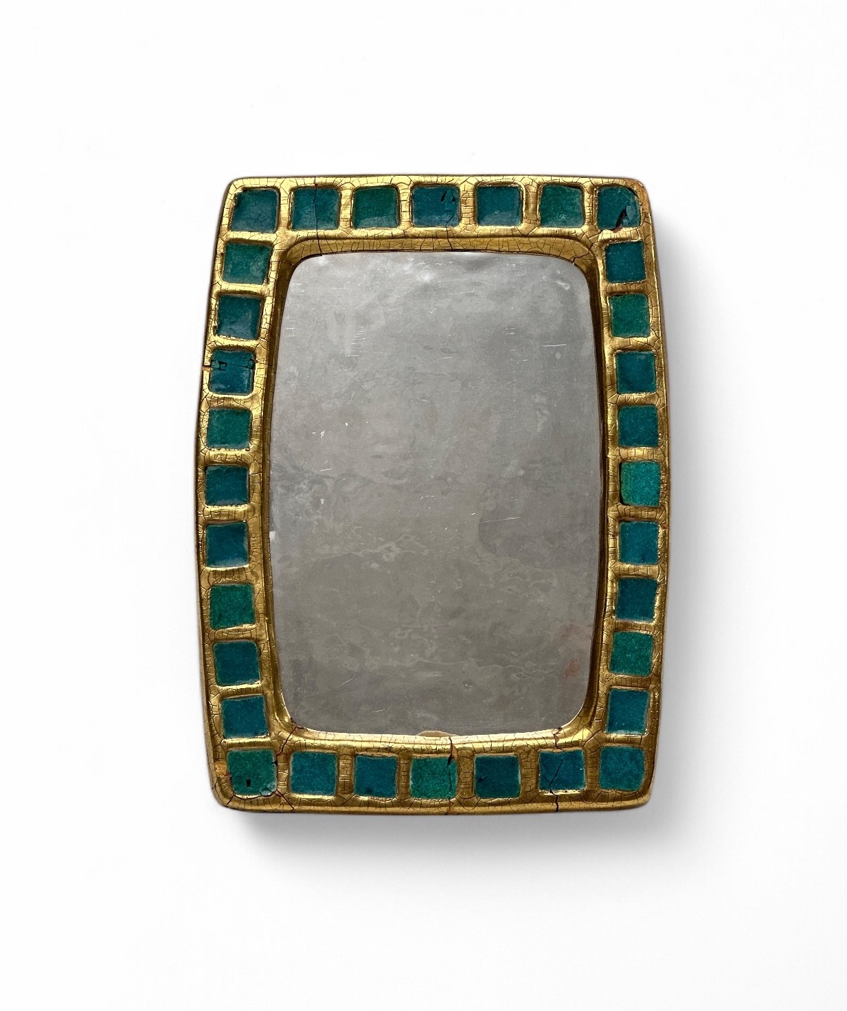 Mithé ESPELT (1923-2020) Pâte de verre long model mirror, circa 1955 Proof in blue stamped clay, cracked gold and crystallized glass H. 32 cm. - L.: 22 cm. (Accidents, missing parts, restorations, a wooden plate has been affixed behind the felt to consolidate the structure). Bibliography - Antoine Candau, Mithé Espelt - le luxe discret du quotidien, Odyssée, 2020, similar model reproduced on p. 111.