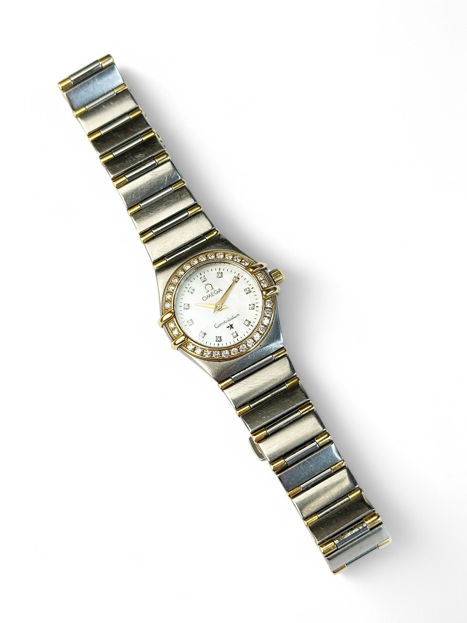 OMEGA CONSTELLATION LADY Steel and gold-plated steel wristwatch, mother-of-pearl dial, gilded applique hour-markers and brilliant-cut diamonds, gilded dauphine hands. Gold-plated steel bezel set with brilliant-cut diamonds. Clipped steel caseback signed Omega and numbered 58486237,895.1203. Quartz movement signed Omega calibre 1456. Steel and gold-plated steel bracelet, folding clasp signed Omega. Movement functional at time of no guarantee of future operation or condition of parts. Scratches to the case, accident to the glass, unscrewed crown. Swiss work circa 1966 Diameter 33 mm Expert: Nicolas Amsellem for Sancy expertise
