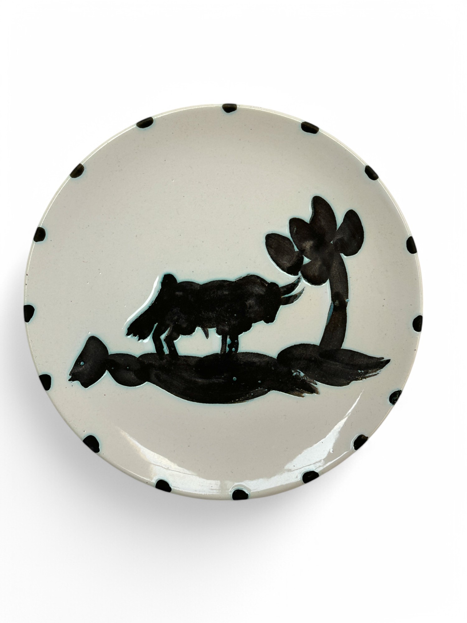 Pablo PICASSO (1881-1973) Round plate, model Taureau sous l'arbre (Bull under a tree) White and black glazed earthenware proof, with decoration highlighted with oxidized kerosene. Marked Edition Picasso and debossed MADOURA Plein Feu and Edition PICASSO on the reverse. Edition of 500. D. 19 cm. Bibliography: - Alain RAMIÉ, Picasso, Catalogue de l'œuvre céramique édité 1947-1971, 1988, similar model reproduced as 159 p. 89. Expert: Romain Coulet
