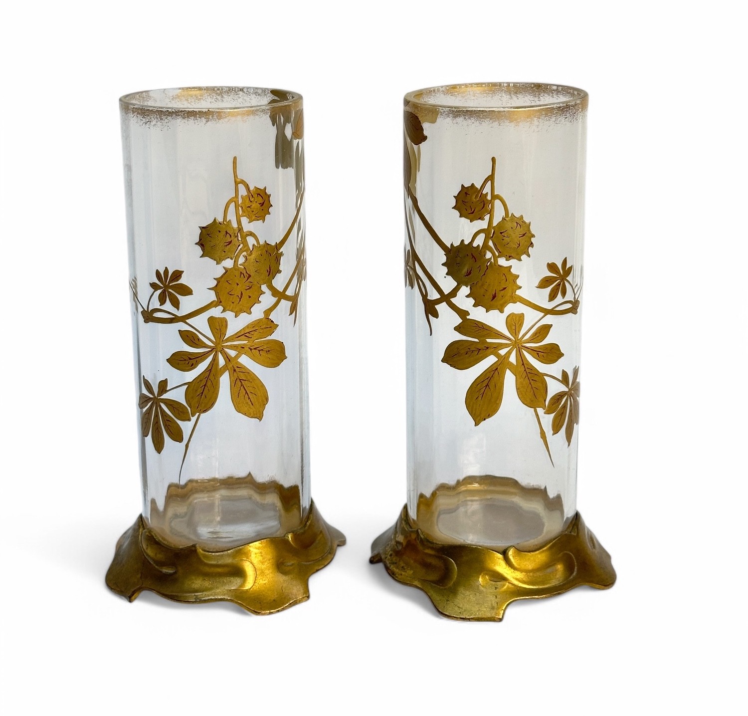 Pair of transparent glass scroll vases on gilded bronze mounts in the Art Nouveau style, gilded decoration of bogues on chestnut branches, gilded heels and lips. Numbered 3 below Height: 22 cm