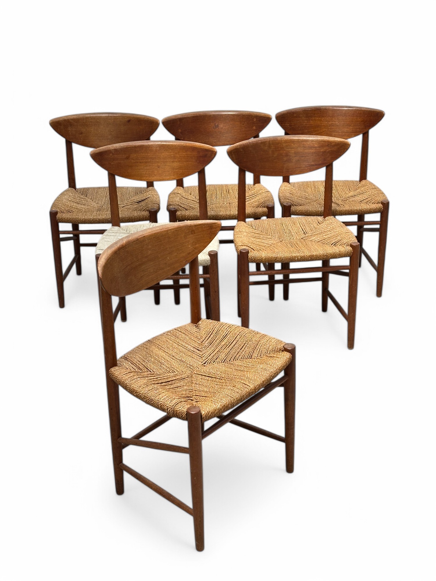 Peter Hvidt (1916-1986) & Orla Mølgaard Nielsen (1907-1993) Suite of six model 316 chairs, circa 1960, with rope seat and boomerang backrest set on a teak structure forming a tapered four-legged base joined by struts. (Threads cut and distended, scratches, wear, one cord not original). H. 76.5 cm. - L.: 49 cm. - D. : 44 cm. Søborg Furniture Edition Bibliography : - Noritsugu Oda, Danish chairs, Chronicle books, 1999, similar model reproduced p.83. Expert : Romain Coulet