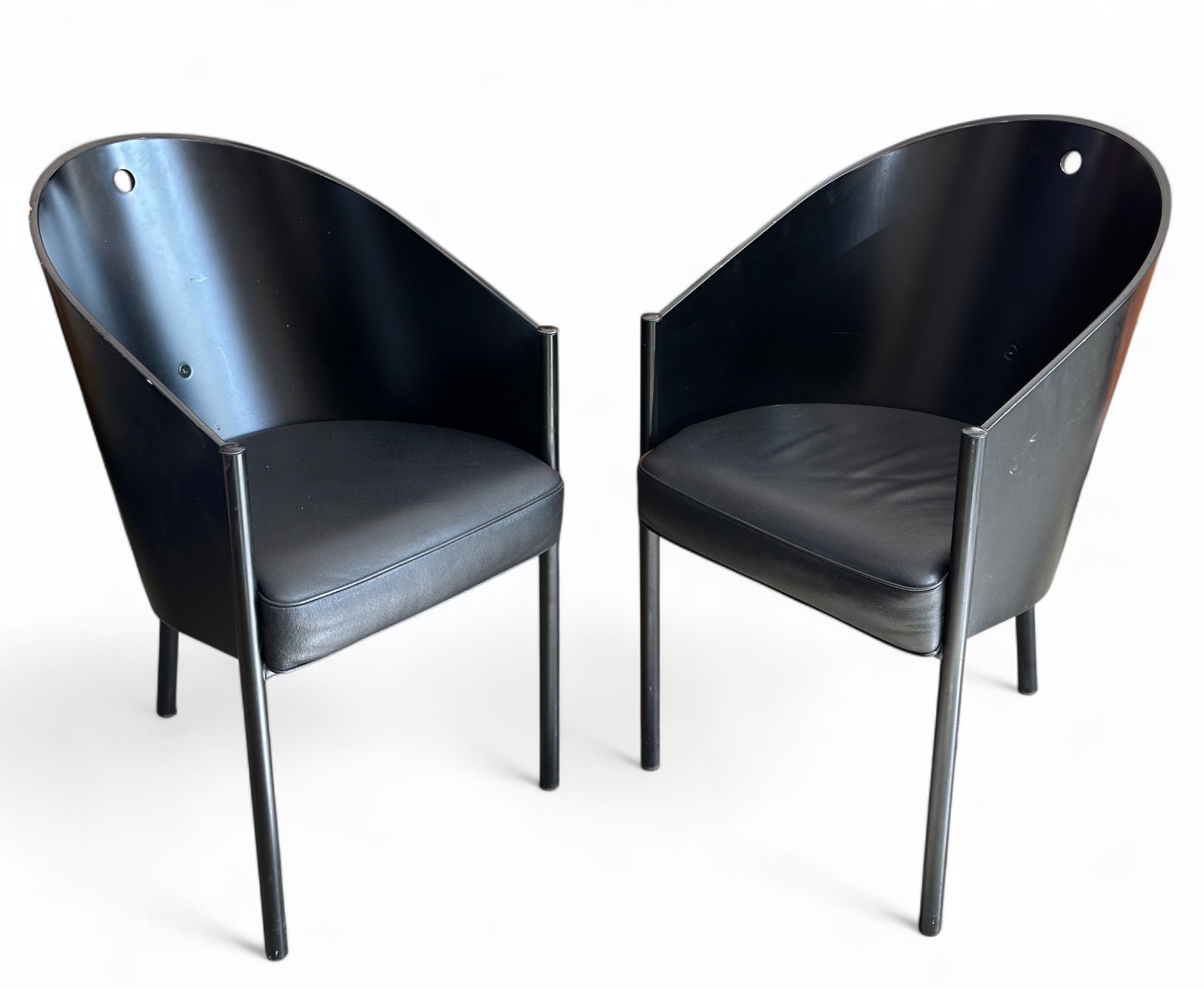 Philippe STARCK (born 1946) Pair of black "Costes" curved plywood armchairs on tubular steel legs, leather-covered seat 79 x 47.5 x 60 cm approx. Wear and tear