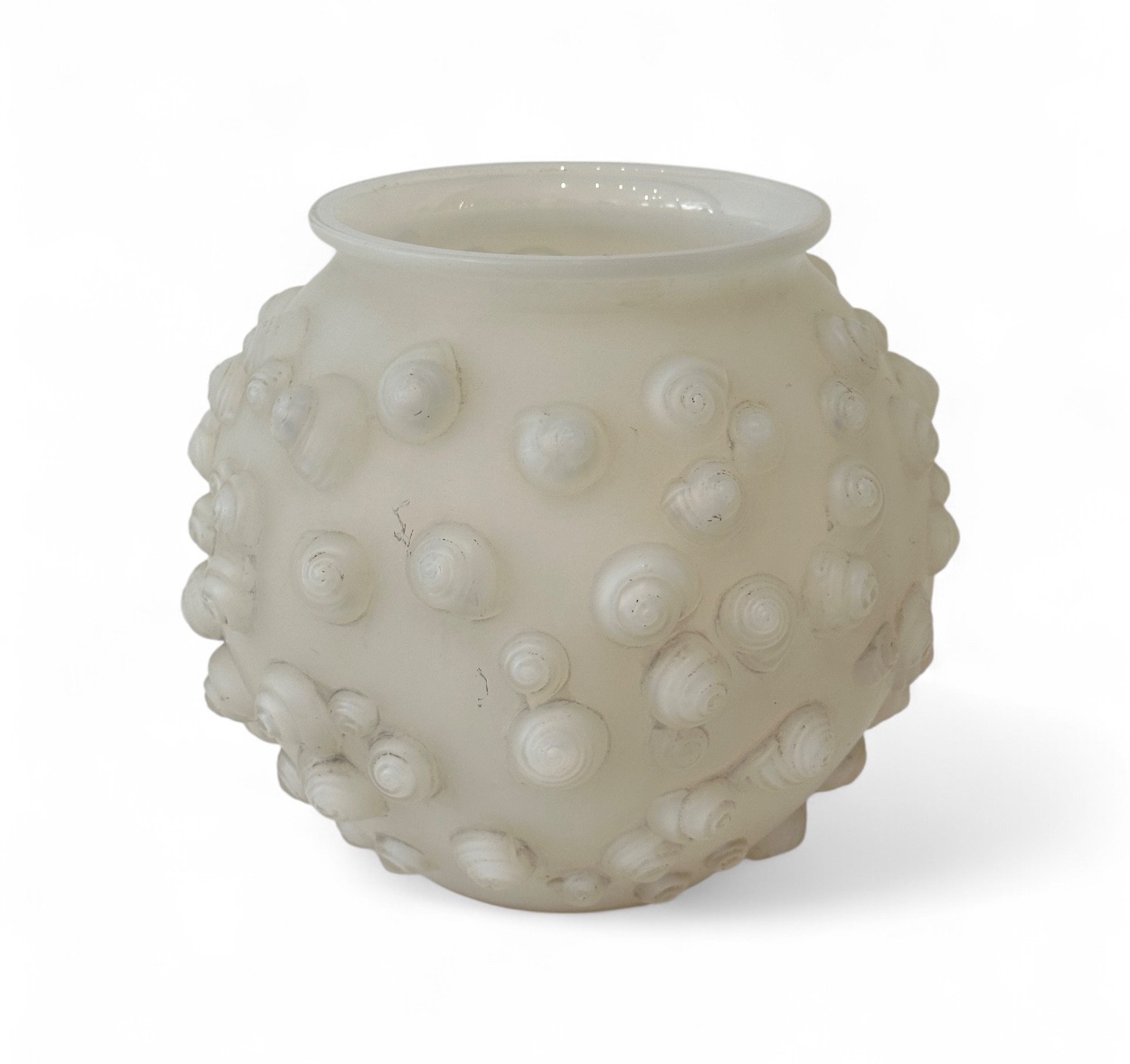 René LALIQUE (1860 - 1945) Palissy" vase, also known as "Escargots", created in 1926. Moulded blown opalescent glass proof (slightly ground neck, minor chips). Signed and numbered on reverse. Height: 17 cm Bibliography: Félix Marcilhac, René Lalique - Catalogue raisonné de l'œuvre de verre, Éditions de l'Amateur, Paris, 2011, section "Vases", model referenced under n°980 and reproduced on p. 434. Expert : Cabinet Marcilhac