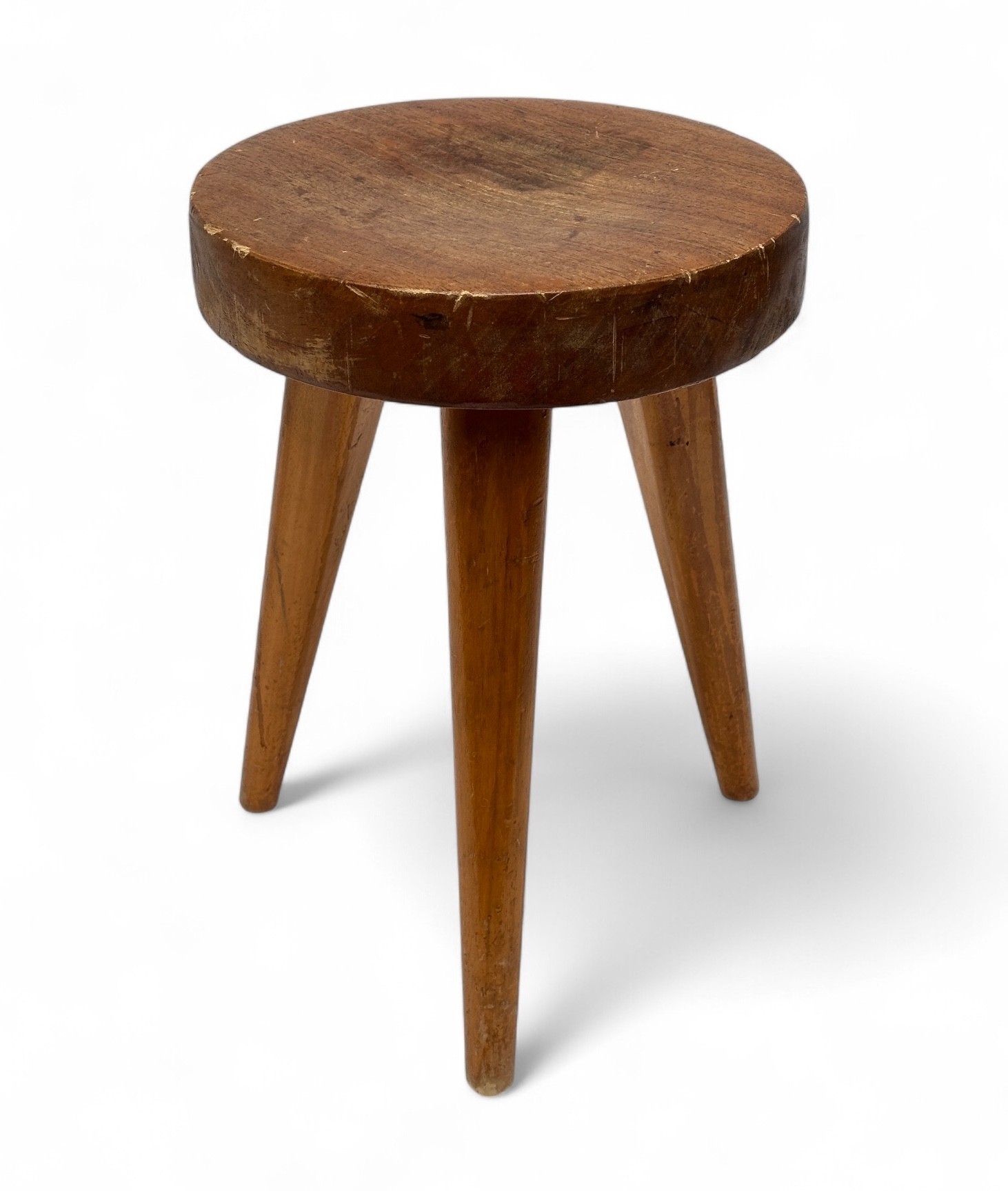 René MARTIN (20th) Pine stool, circa 1970, with thick, slightly hollowed circular seat resting on three tapered legs. H. 43 cm - D. 29 cm Note: René Martin was Charlotte Perriand's cabinetmaker in Méribel-les-Allues. "In the Allues valley we had two young carpenters working for us, one Chardonnet, the other Martin, known as Ciseaux, both brought up in the good tradition of carpenters from father to son, capable of making anything and even of innovating with talent", Charlotte PERRIAND, une vie de création, op. cit., p. 225. Expert : Romain Coulet