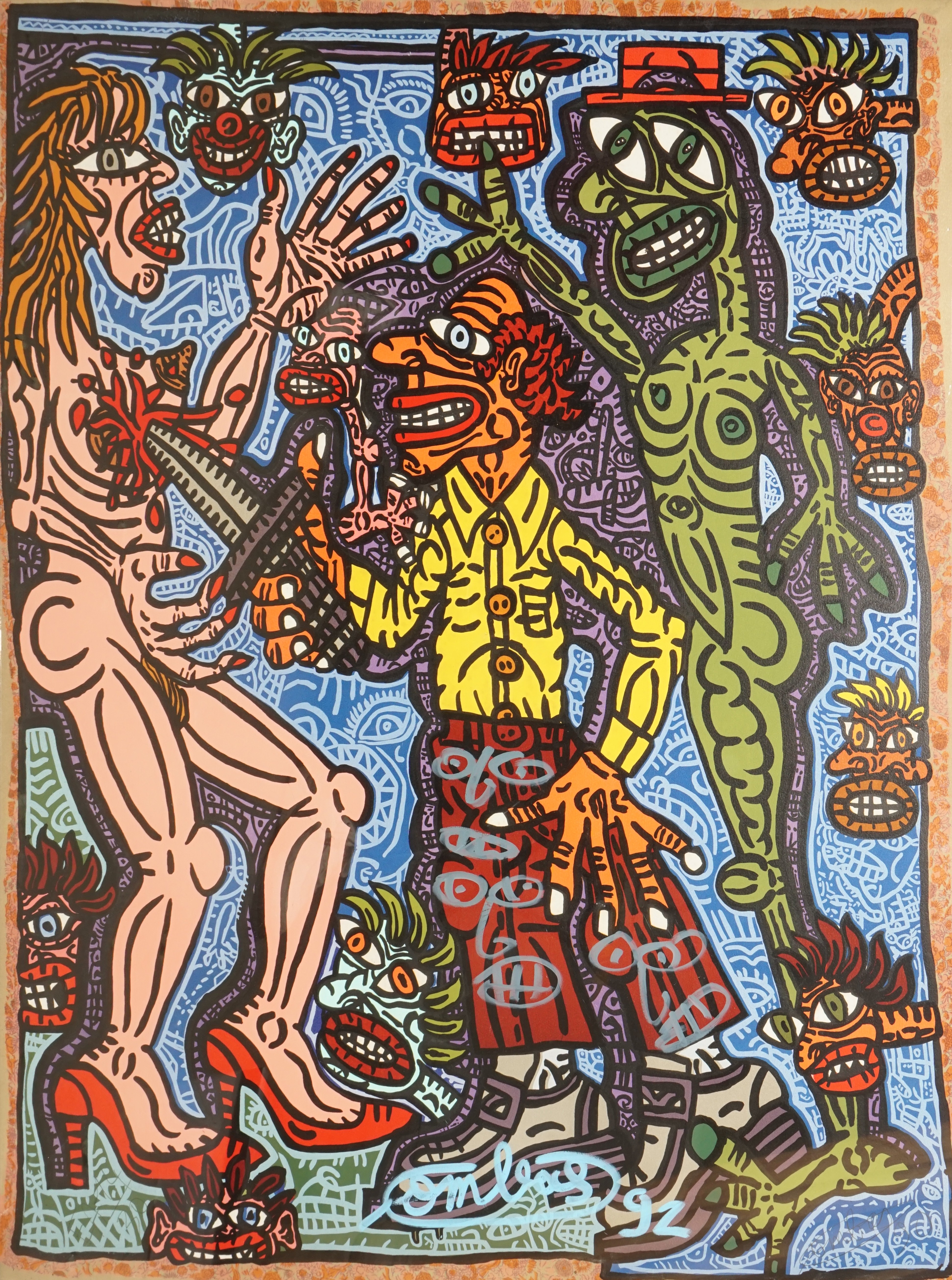 Robert COMBAS (born 1957) Plantage de femme en rigolade, 1990 Silkscreen in color n°EA 14/30 with highlights in blue paint Signed and dated lower right, signed and dated 1992 lower center in blue paint 110 x 83 cm