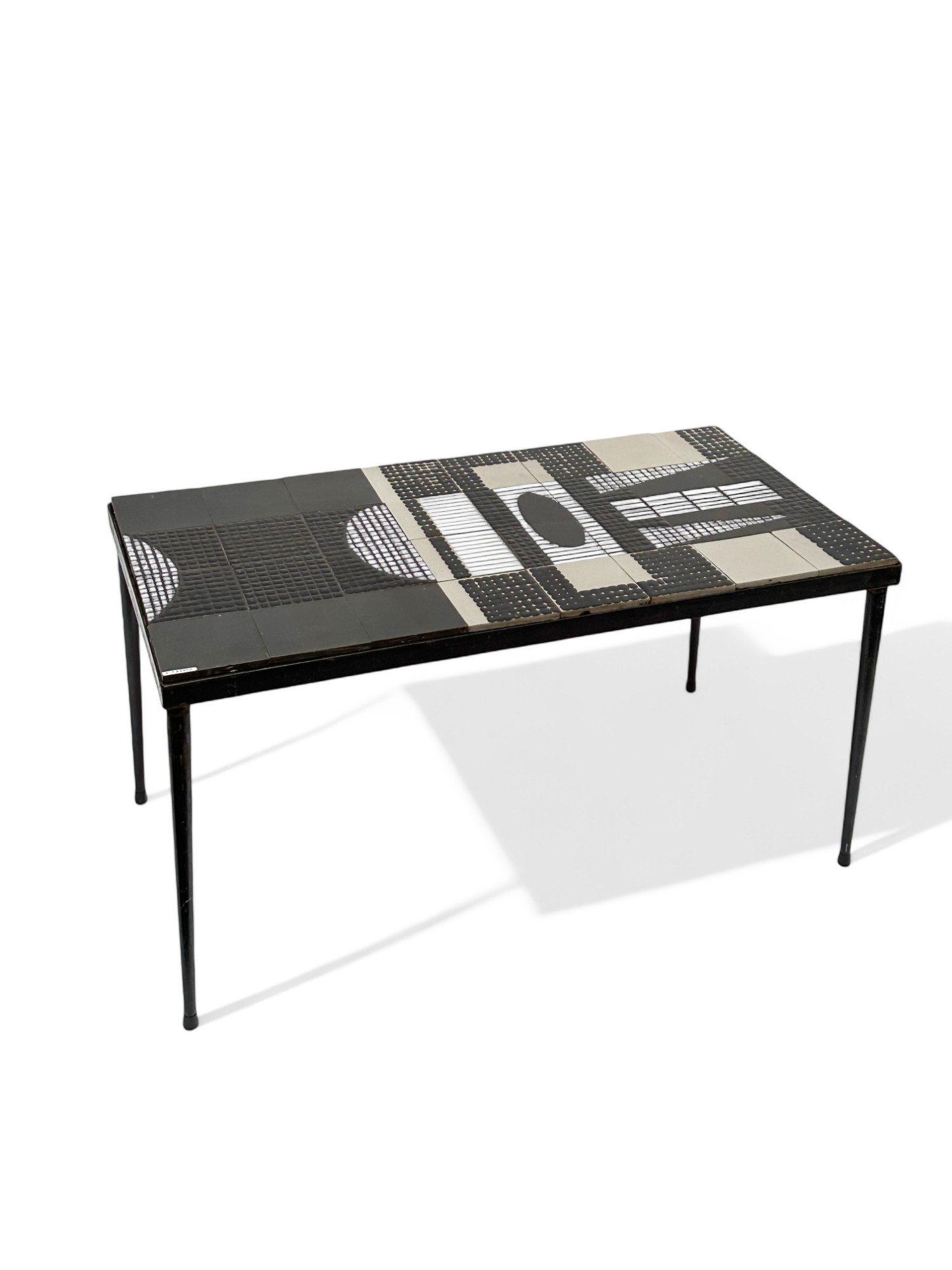 Roger CAPRON (1922-2006) Coffee table, circa 1959, with rectangular black-white and gray glazed ceramic top with geometric decoration, set on a later black-lacquered metal structure forming a four-legged base. Signed R. Capron in a corner of the top. 40 x 78 x 39.5 cm approx. (Non-original structure, scratches, oxidation) Expert : Romain Coulet