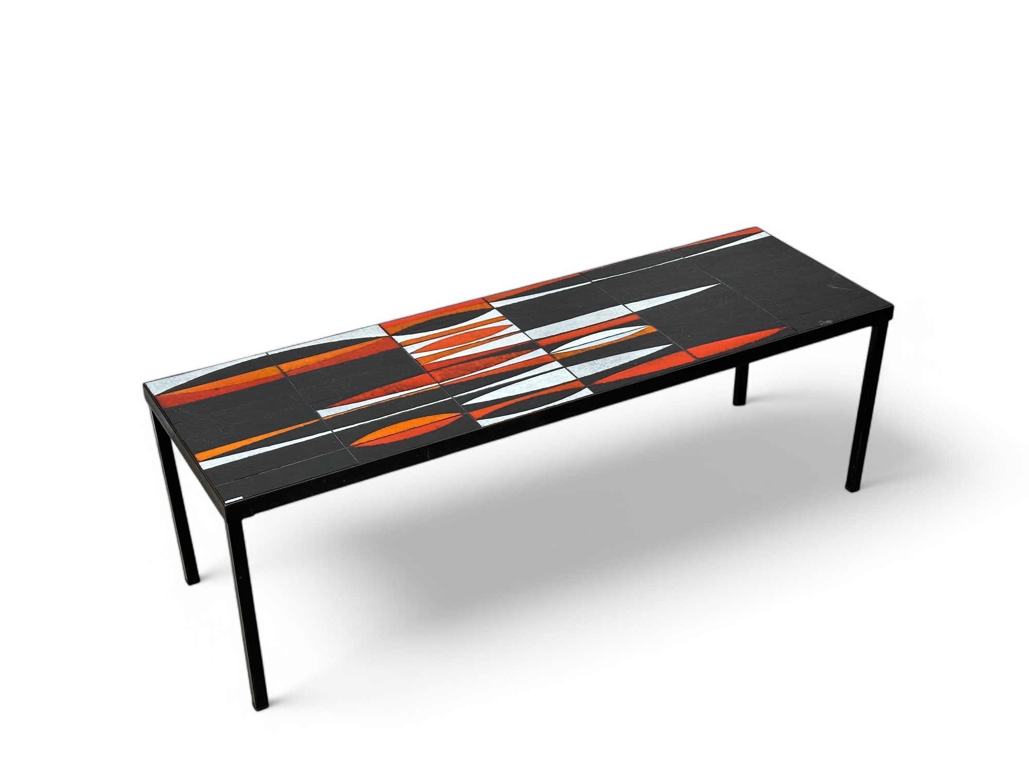 Roger CAPRON (1922-2006) Coffee table, circa 1960, with rectangular top decorated with red, black, orange and white glazed ceramic shuttle tiles on a black-lacquered metal structure forming the base. Signed R. Capron in one corner. H. Height : 39 cm. - W. : 120 - D. : 38.5 cm Bibliography - Pierre Staudenmeyer, Roger Capron céramiste, Norma, 2003, similar model reproduced on p. 85. - Pierre Staundenmeyer, Roger Capron céramiste, Norma, 2023, similar model reproduced on p. 110. Expert: Romain Coulet