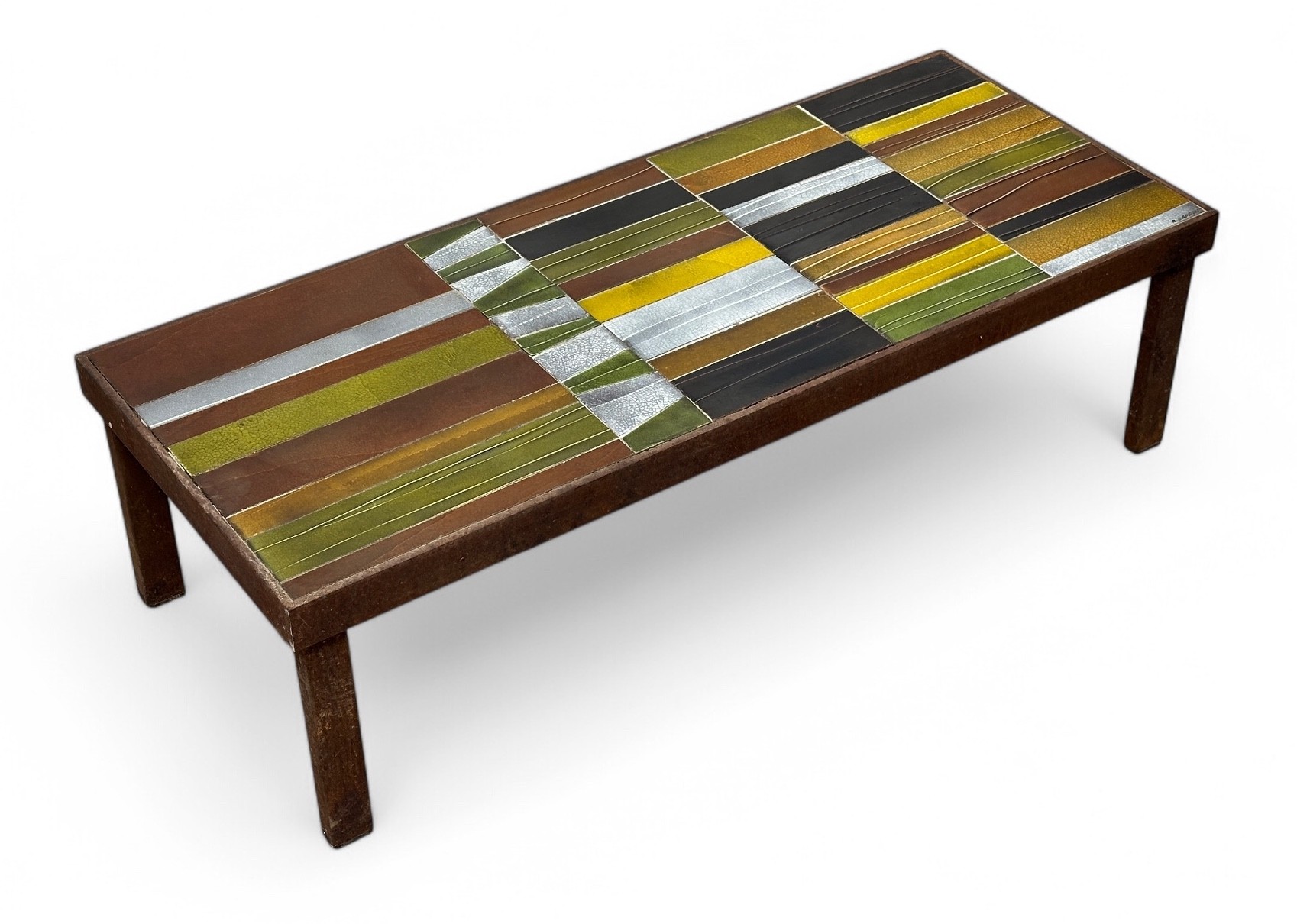 Roger CAPRON (1922-2006) Coffee table, circa 1965, with rectangular top featuring geometrically decorated brown, green and yellow-gray glazed ceramic tiles on an oxidized metal structure forming a four-legged base. Signed R. Capron in one corner. (Scratches, wear, missing joints, oxidation) 29.5 x 102 x 42 cm Expert : Romain Coulet