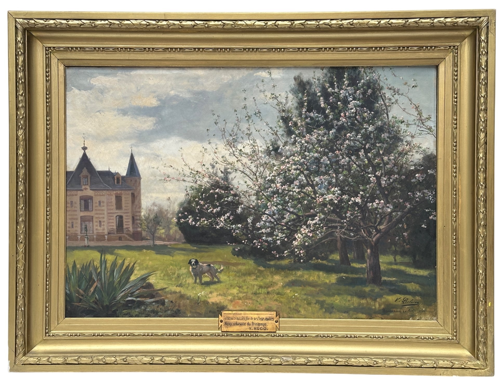 Victor LECLAIRE (1830-1885) The dog in front of the château's flowering trees Oil on canvas Signed, localized "Beauverger" and dated April 20, 1880 lower right 55 x 80 cm Holes