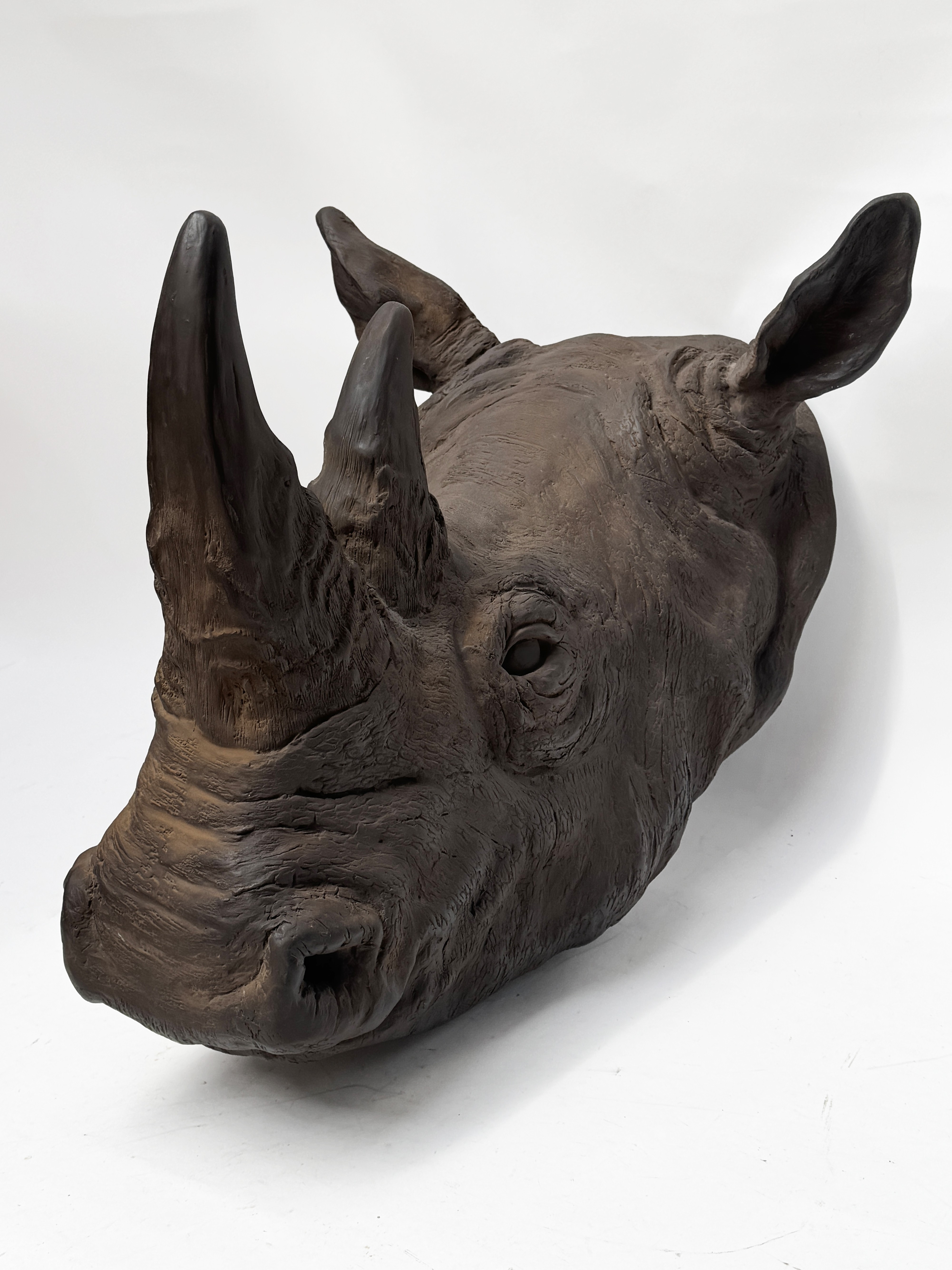 White rhinoceros head. Proof in patinated resin. Size: 78 x 52 cm.