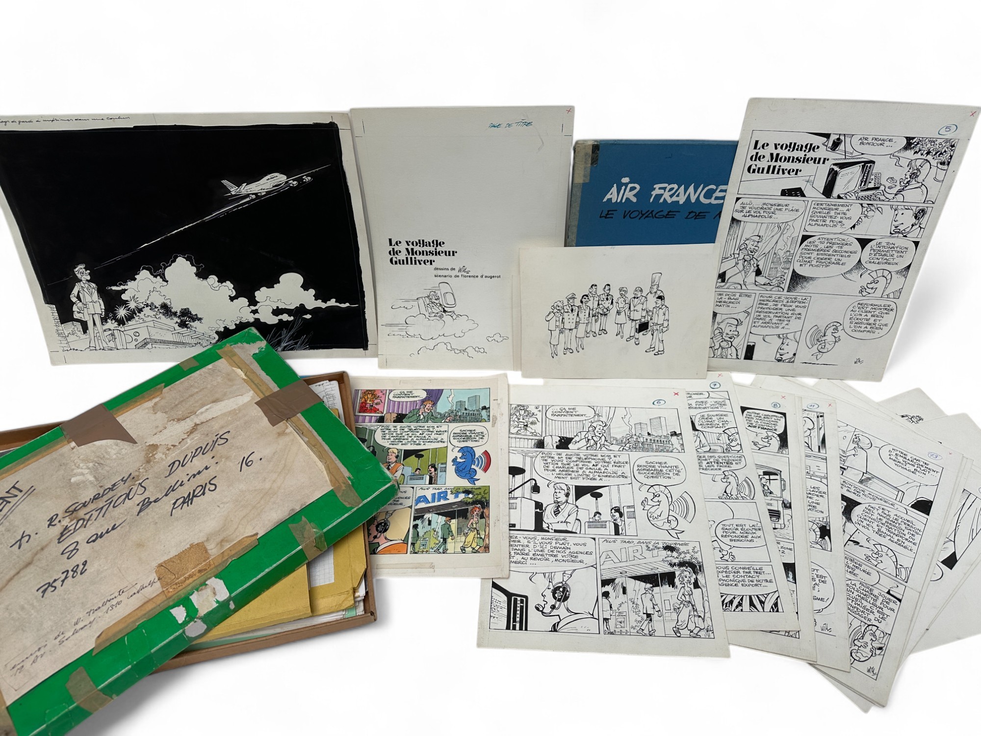 Rare set of a project for a comic strip advertising booklet for Air France comprising 19 original plates, endpapers, title page and illustrations, on a scenario by Florence d'Augerot.
