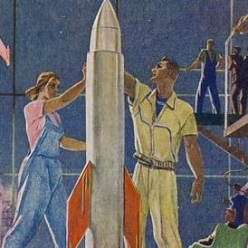 Cette composition lumineuse, qui mêle figures humaines et architectures en construction, incarne la vision optimiste d’un avenir façonné par le progrès et le travail commun.