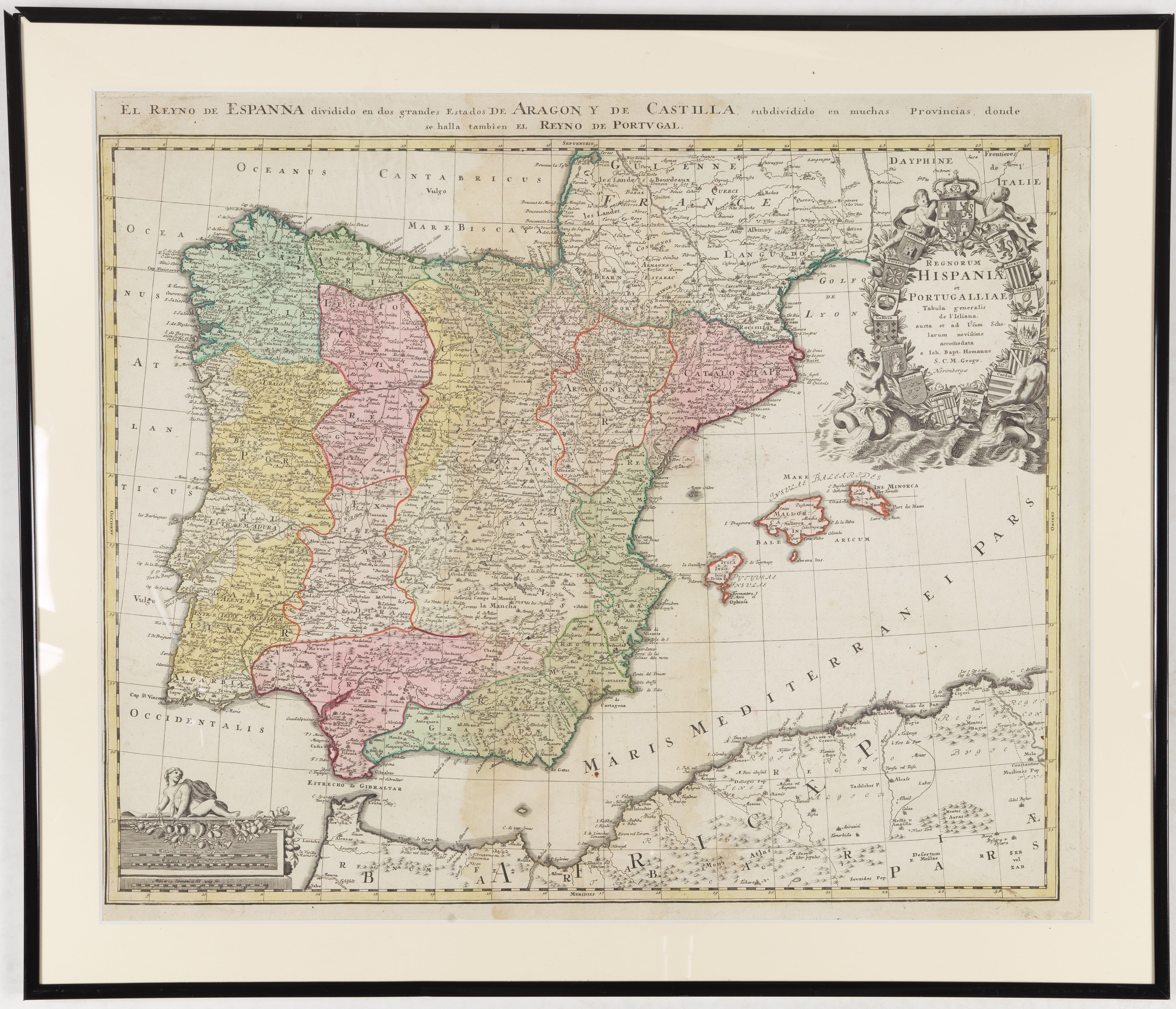 HOMANN, J. B. Regnorum Hispaniae et Portugalliae. . . Nuremberg, ca 1750. Col. d'époque. Papier un peu froissé, quelques brunissures. Encadré (non examiné hors du cadre). 470 x 580 mm